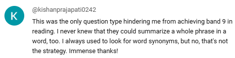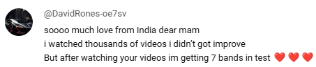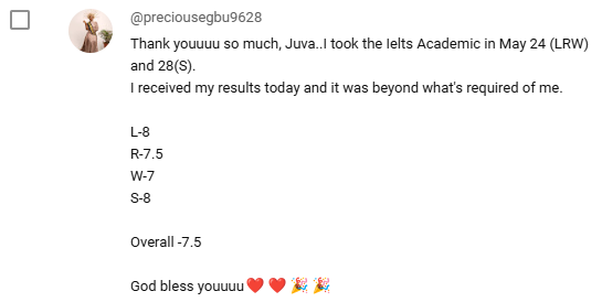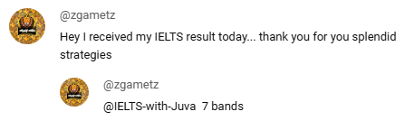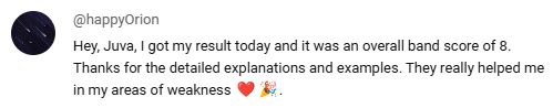 "Hey, Juva, I got my result ... overall band score of 8. Thanks for the detailed explanations and examples. They really helped me in my areas of weakness ❤️🎉."