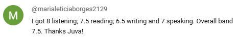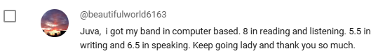 "Juva, i got ... 8 in reading and listening. 5.5 in writing and 6.5 in speaking. Keep going lady and thank you so much."