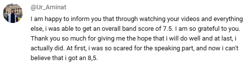 "Thank you so much for giving me the hope that i will do well and at last, i actually did. At first, i was so scared for the speaking part, and now i can't believe that i got 8,5."