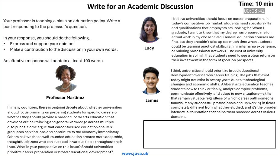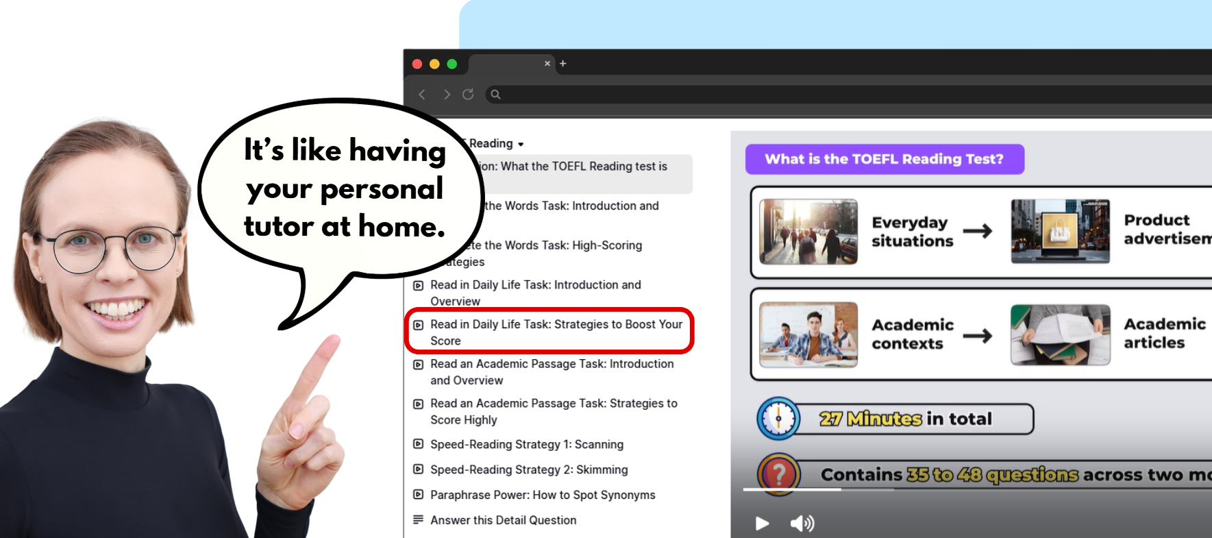 Learn all you must know for the TOEFL iBT 2026 from the comfort of your home. Juva walks you through all TOEFL Tasks step-by-step, so you will be ready for test day. Study wherever you want and whenever you like.